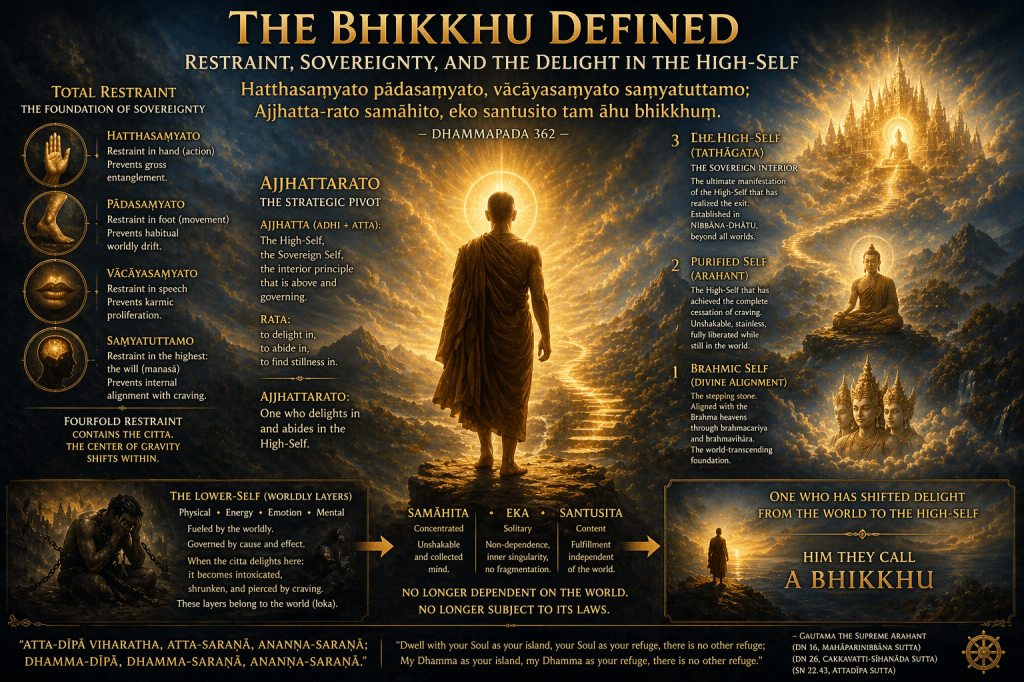 A bhikkhu is one who has achieved total restraint in action, movement, speech, and will, thereby establishing sovereignty over the citta. Through this discipline, the center of gravity shifts from the worldly layers of existence to the High-Self (Ajjhatta). Delighting in this High-Self, the practitioner aligns first with the Brahmic order, then realizes the purified identity of the Arahant, and finally establishes the liberated identity of the Tathāgata in Nibbāna-dhātu. Established in this inner sovereignty, the citta becomes concentrated, unified, solitary, and fully content—no longer dependent on the world, and no longer subject to its laws. This is who is rightly called a bhikkhu.