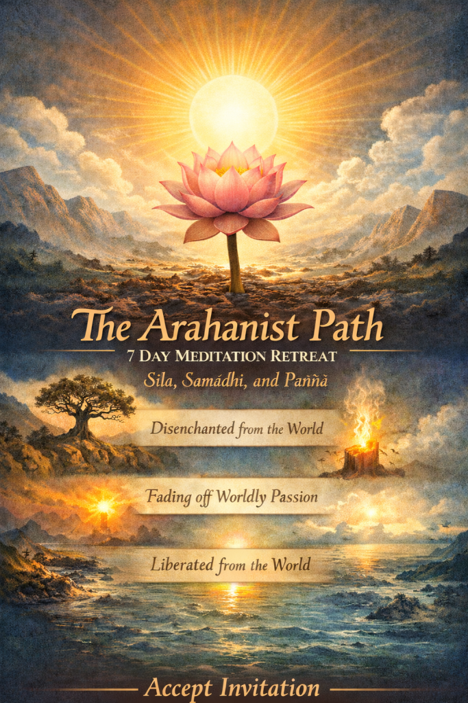 This 7-day intensive retreat is a rare opportunity to enter the direct training established by Gautama Buddha, the Supreme Arahant, for those awakening to seek full liberation from the world. The Arahanist Path is a precise and demanding training aimed at dismantling the forces that bind the mind to worldly existence and initiating a profound transformation that transcends human limits—going beyond the human condition to become more than human.